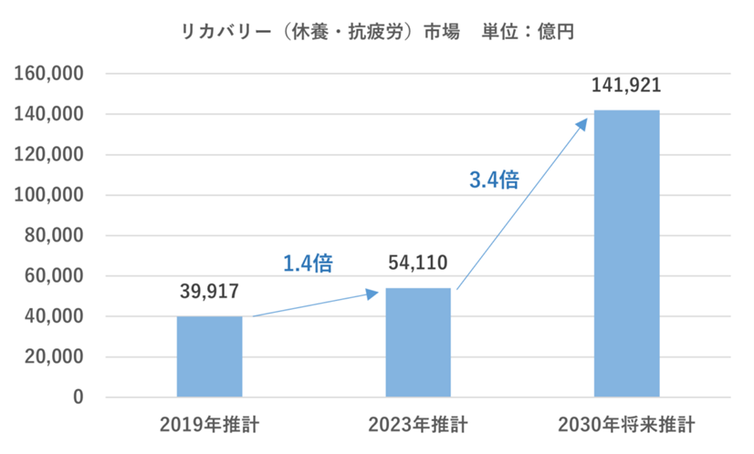 疲労が社会問題にもなっている今、リカバリーが大人気!健康食品やリラクゼーション施設は伸び続け、2030年には14兆円市場になると予測されています。