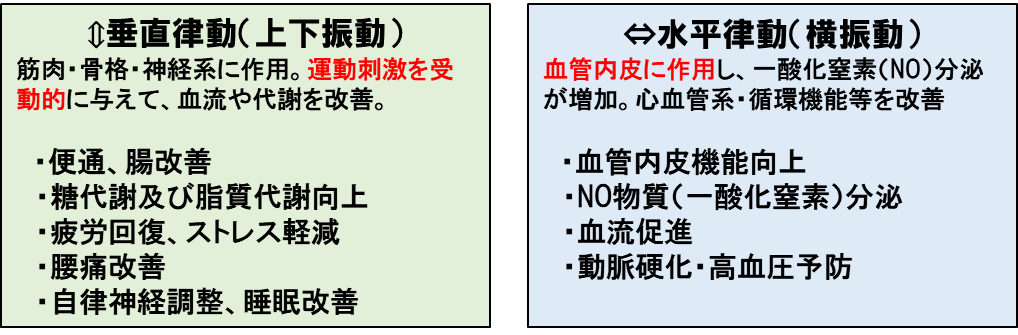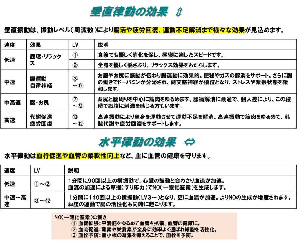 現在、振動療法の研究がどんどん進み、振動の方向(縦横)や振動速度の違いで様々な健康効果が分かっています。