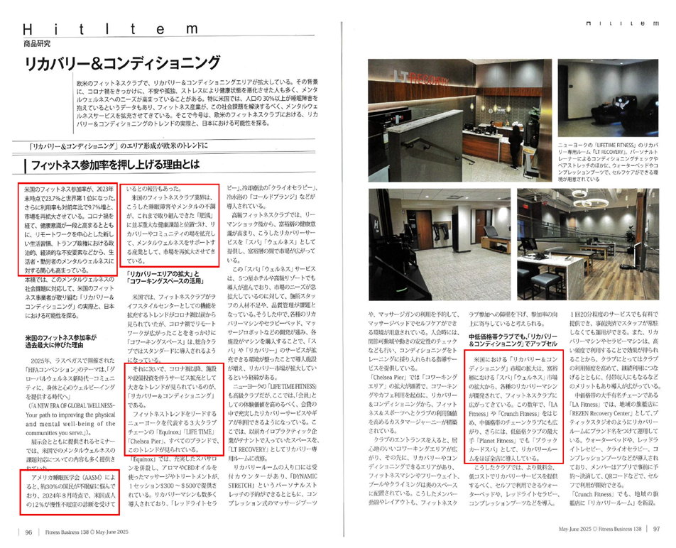 アメリカでもコロナ過以降、睡眠障害やメンタルヘルスが問題になり、全米のフィットネスクラブではリカバリールームが大人気!リカバリールームの拡大で、「癒し需要」の新規客を獲得し、フィットネス参加率を跳ね上げて、世界一位となるほど、リカバリールームは大人気となりました。
