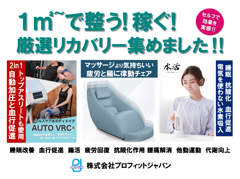 律動チェア以外にも、「電気を使わない水素吸入の水活」「トレーニング&リカバリーの自動加圧VRC」など、省スペースで血流や代謝にアプローチするリカバリー機器を出展いたします。